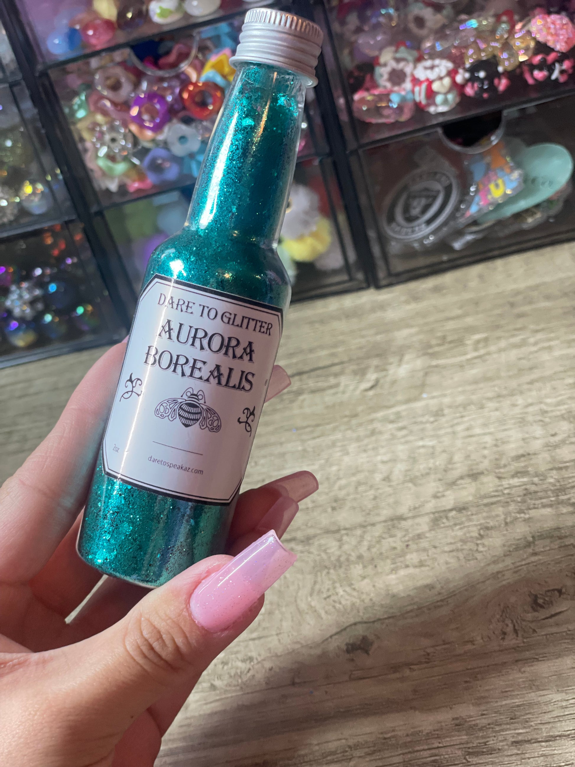 Create your own unique glitter mix with Aurora Borealis by Dare to Speak Az! Choose up to 3 different glitters and watch as they are mixed and placed into a beautiful snow globe cup. Perfectly paired with a UVDTF cup wrap.